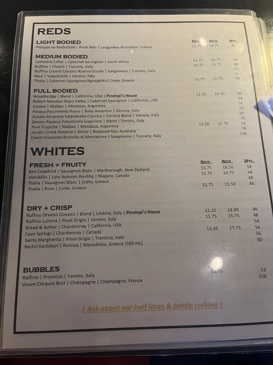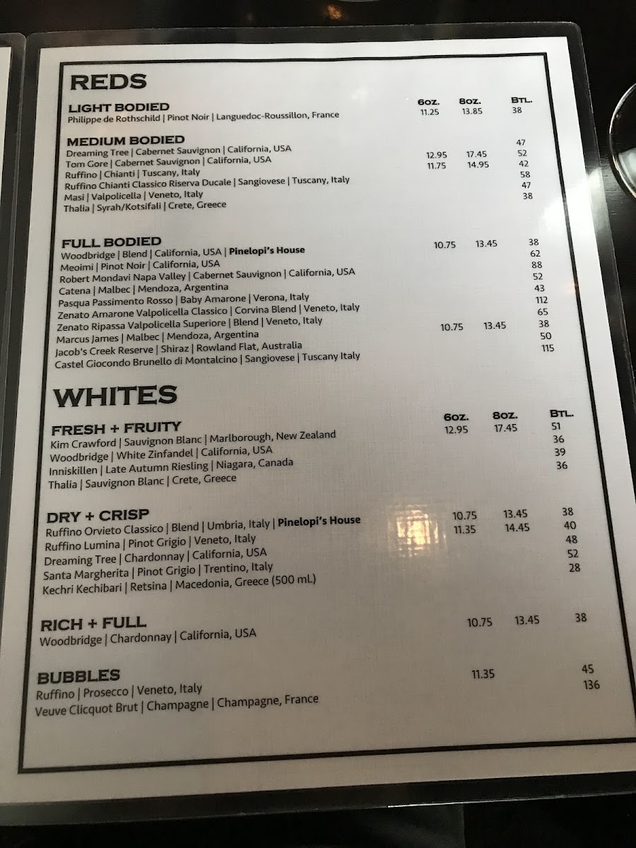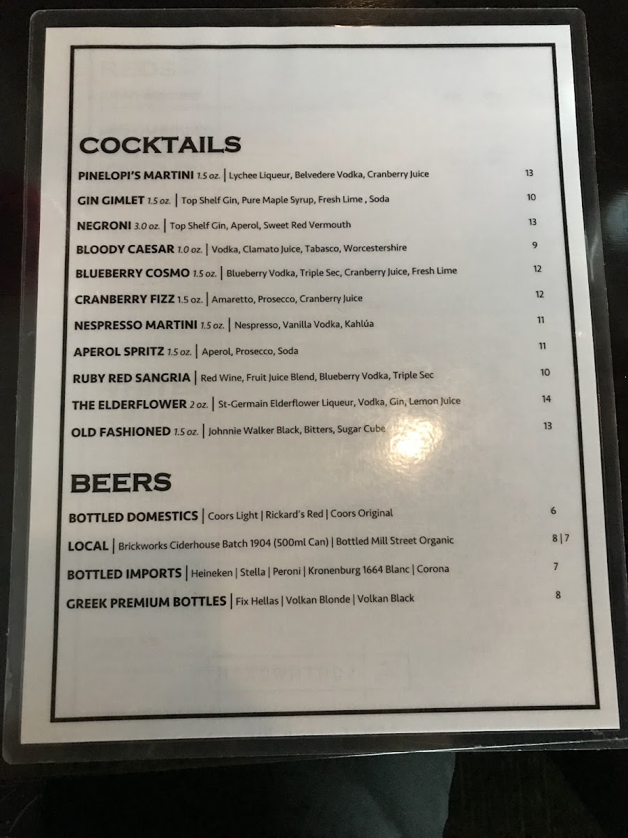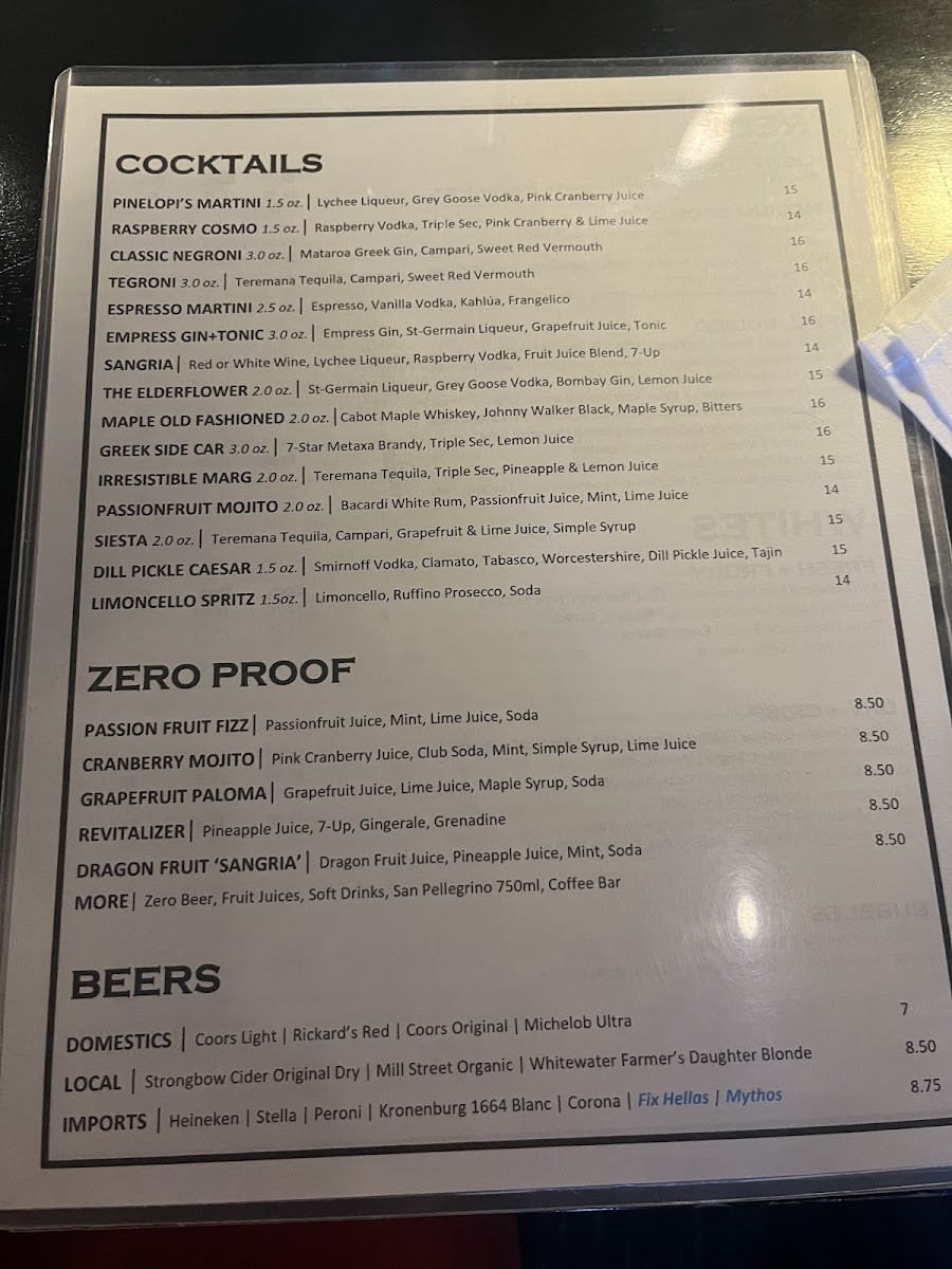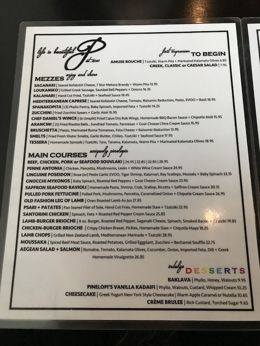 The menu at Pinelopi's Greek Kitchen offers a diverse selection of dishes combining traditional Greek cuisine with Italian influences, suitable for fine dining experiences. It includes a range of appetizers, main courses, sides, and desserts that reflect both cultural backgrounds.